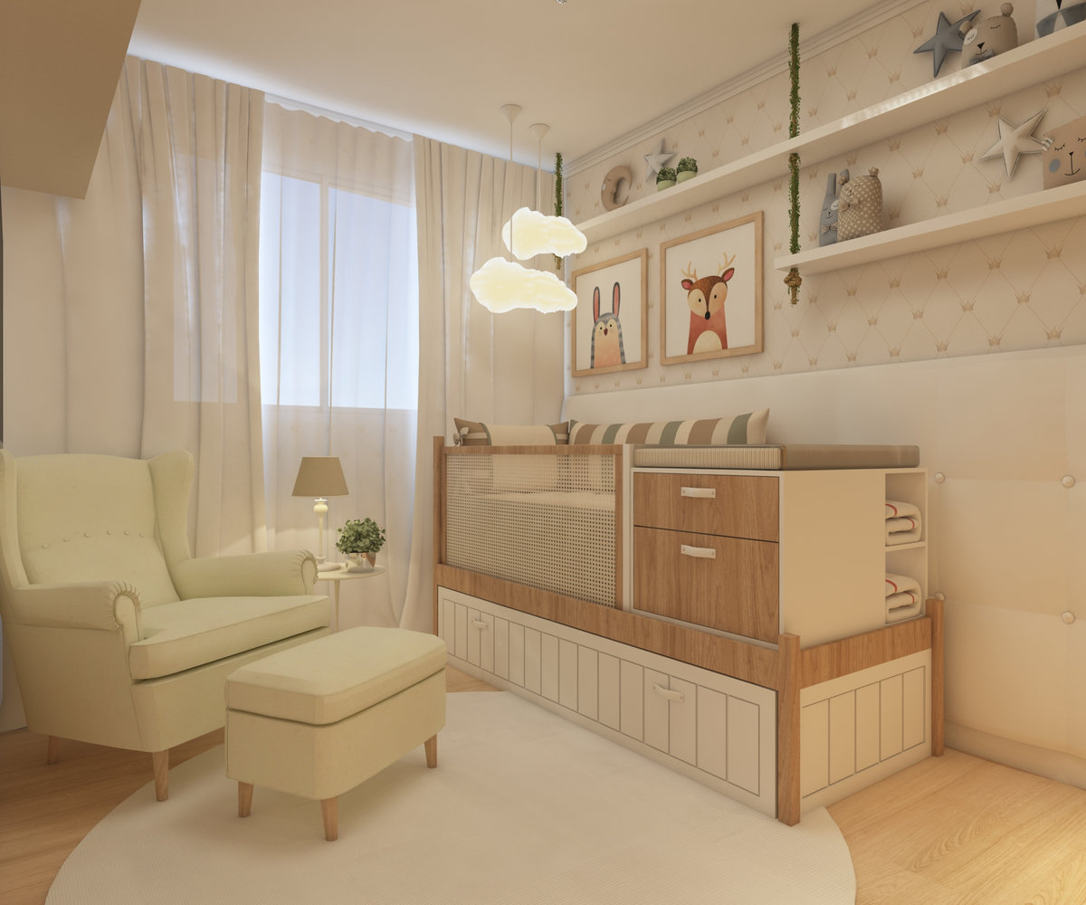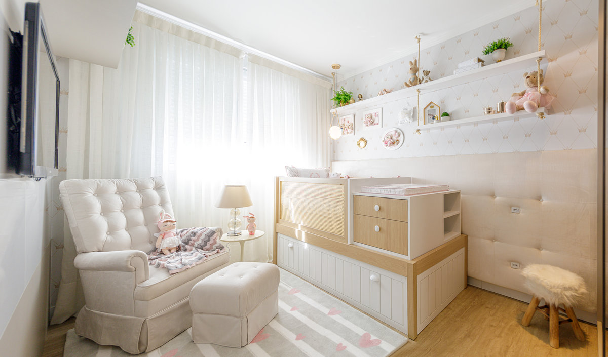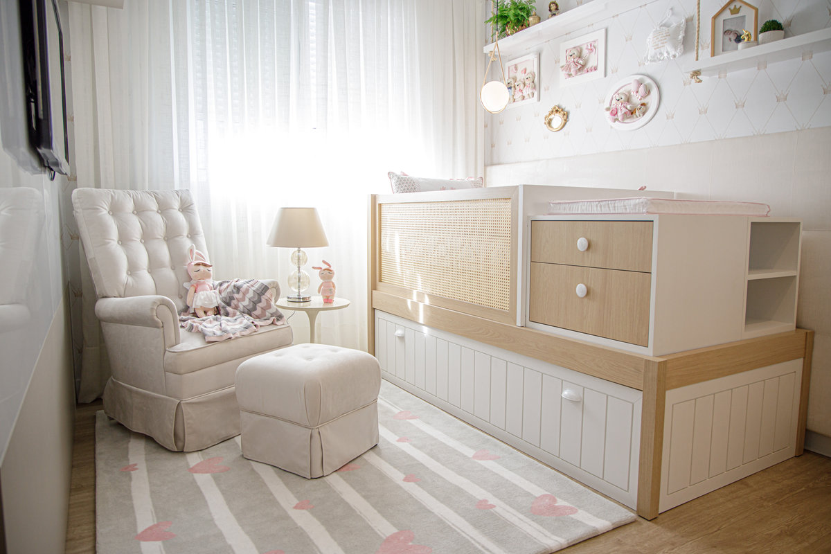 O mobiliário foi cuidadosamente escolhido para unir funcionalidade e charme. O berço multifuncional integra gavetas e prateleiras, otimizando o espaço e proporcionando organização para os itens do dia a dia, além de se transformar em uma cama de solteiro, garantindo praticidade e prolongando o uso do mobiliário conforme o bebê crescer. Já a poltrona de amamentação, acompanhada do puff, oferece conforto para os momentos de carinho e cuidado entre mãe e filha.