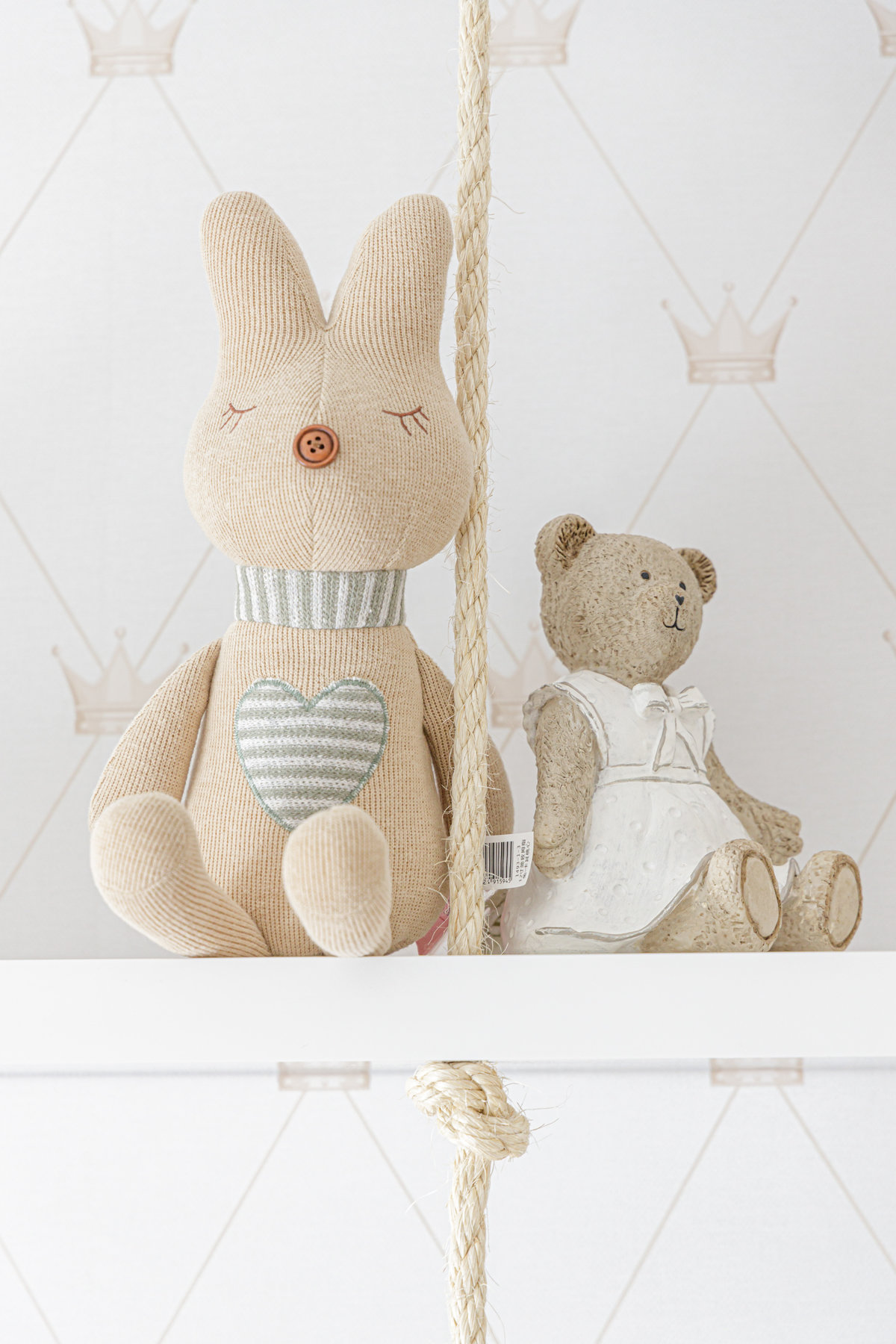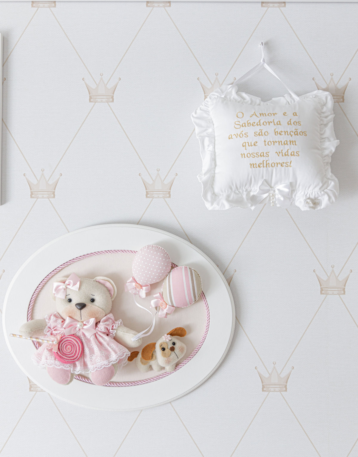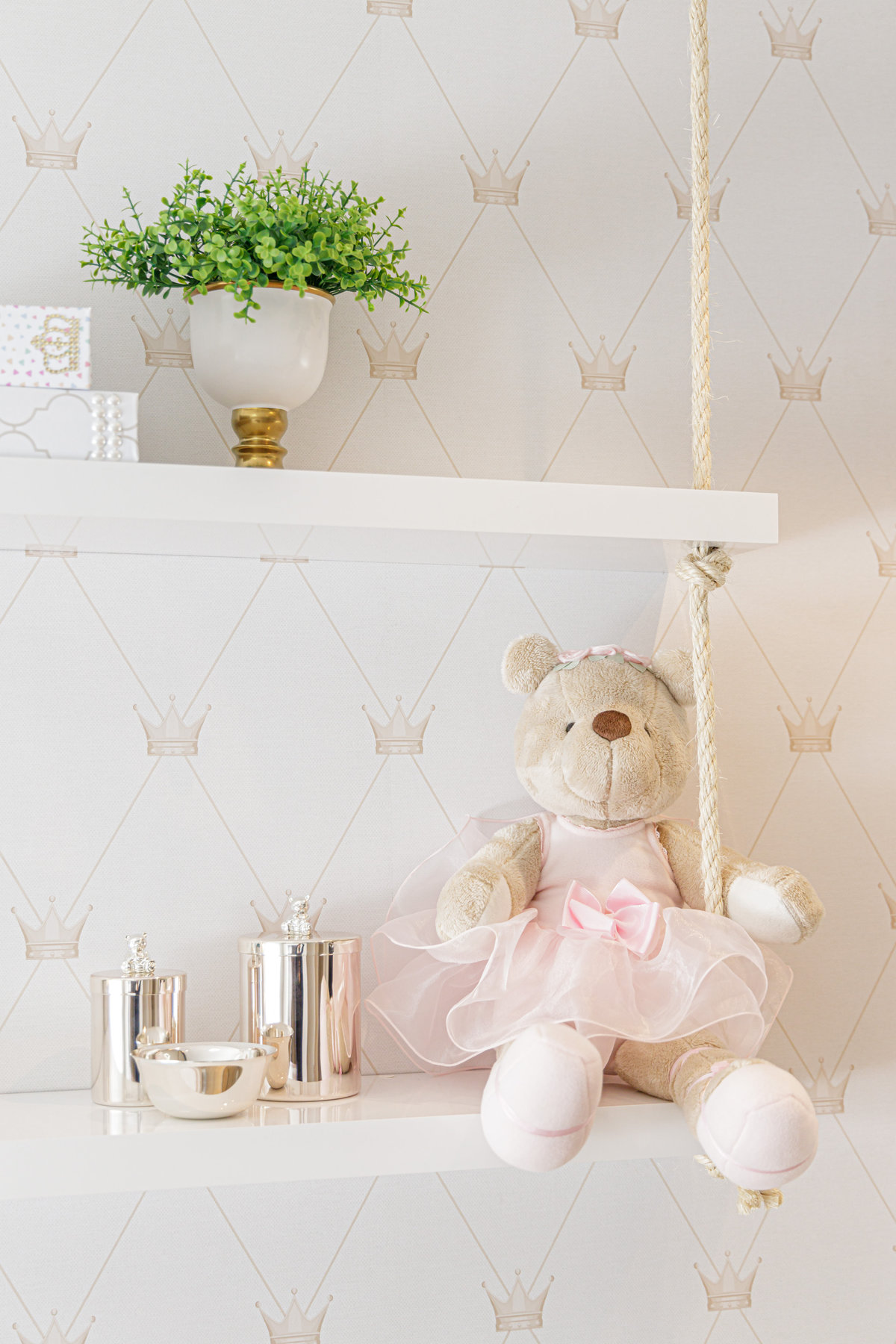 Os detalhes decorativos trazem identidade e delicadeza ao ambiente: os ursos de pelúcia, os quadros lúdicos e os elementos de decoração conferem uma atmosfera acolhedora e personalizada. O papel de parede com estampa discreta reforça a doçura do espaço, enquanto o tapete listrado com corações completa a composição com um toque lúdico.