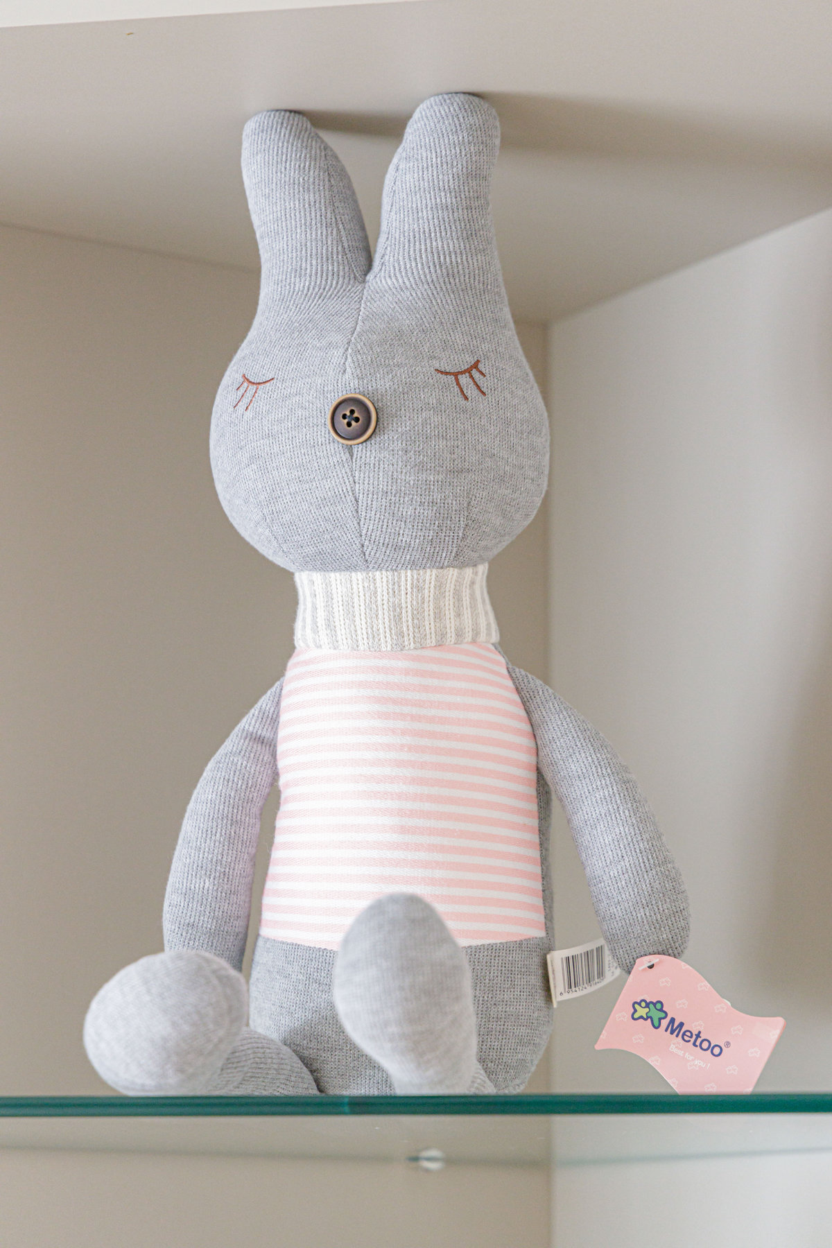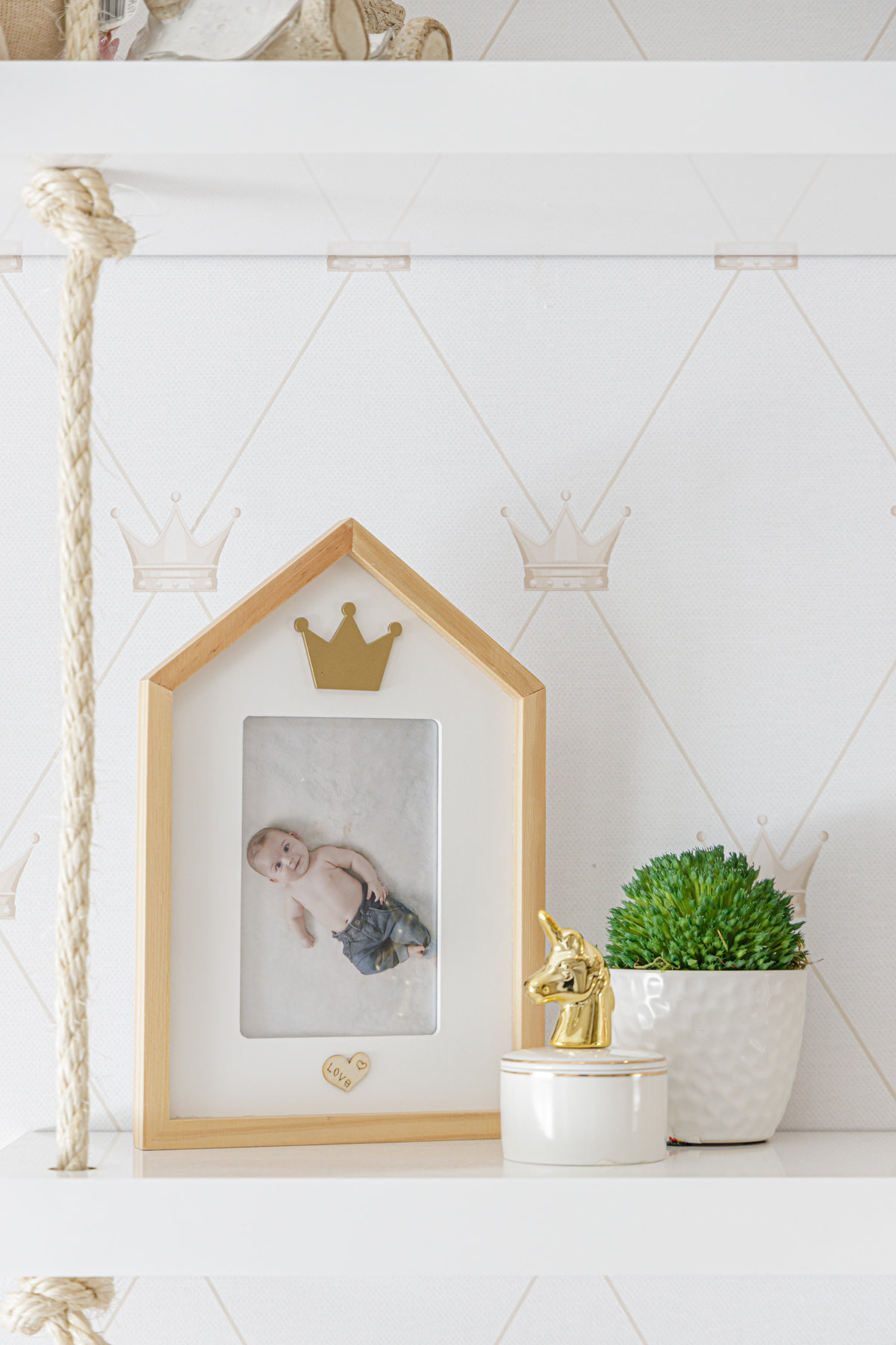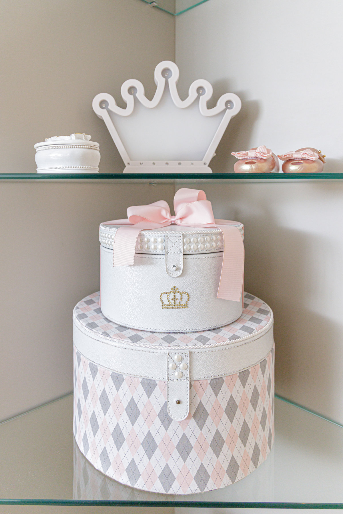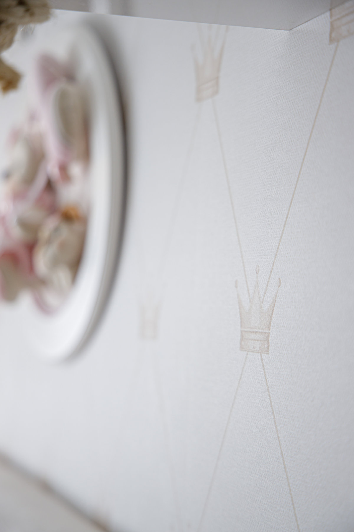 Os detalhes decorativos trazem identidade e delicadeza ao ambiente: os ursos de pelúcia, os quadros lúdicos e os elementos de decoração conferem uma atmosfera acolhedora e personalizada. O papel de parede com estampa discreta reforça a doçura do espaço, enquanto o tapete listrado com corações completa a composição com um toque lúdico.