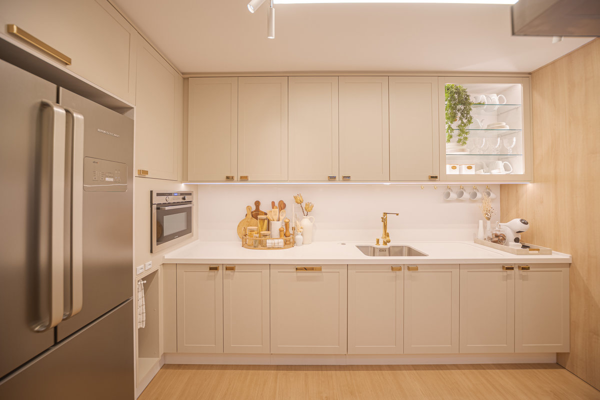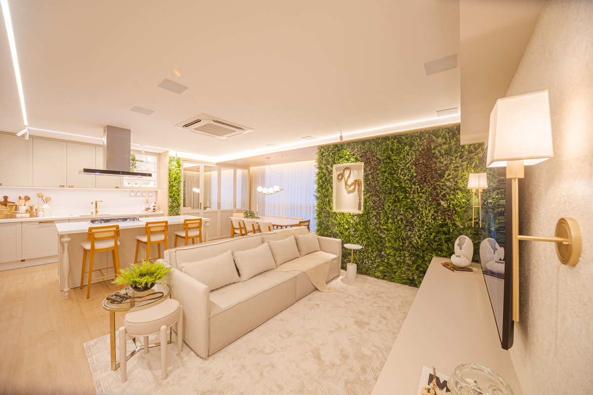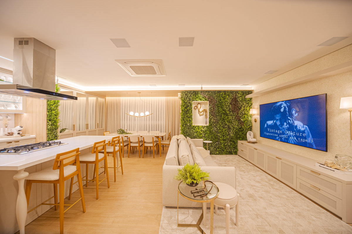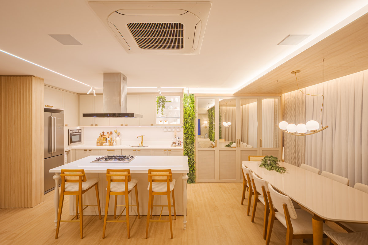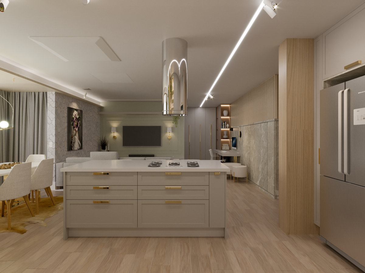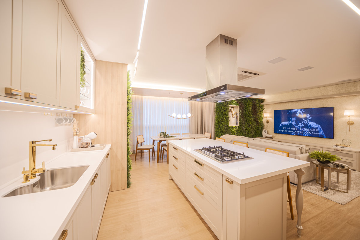 A cozinha integrada é um dos pontos de destaque, com ilha central que funciona como espaço de preparo, apoio e convívio. Os armários em acabamento clean e os metais dourados trazem delicadeza e sofisticação, enquanto a marcenaria sob medida garante funcionalidade e organização. A iluminação linear embutida valoriza o design e proporciona um clima moderno e intimista.