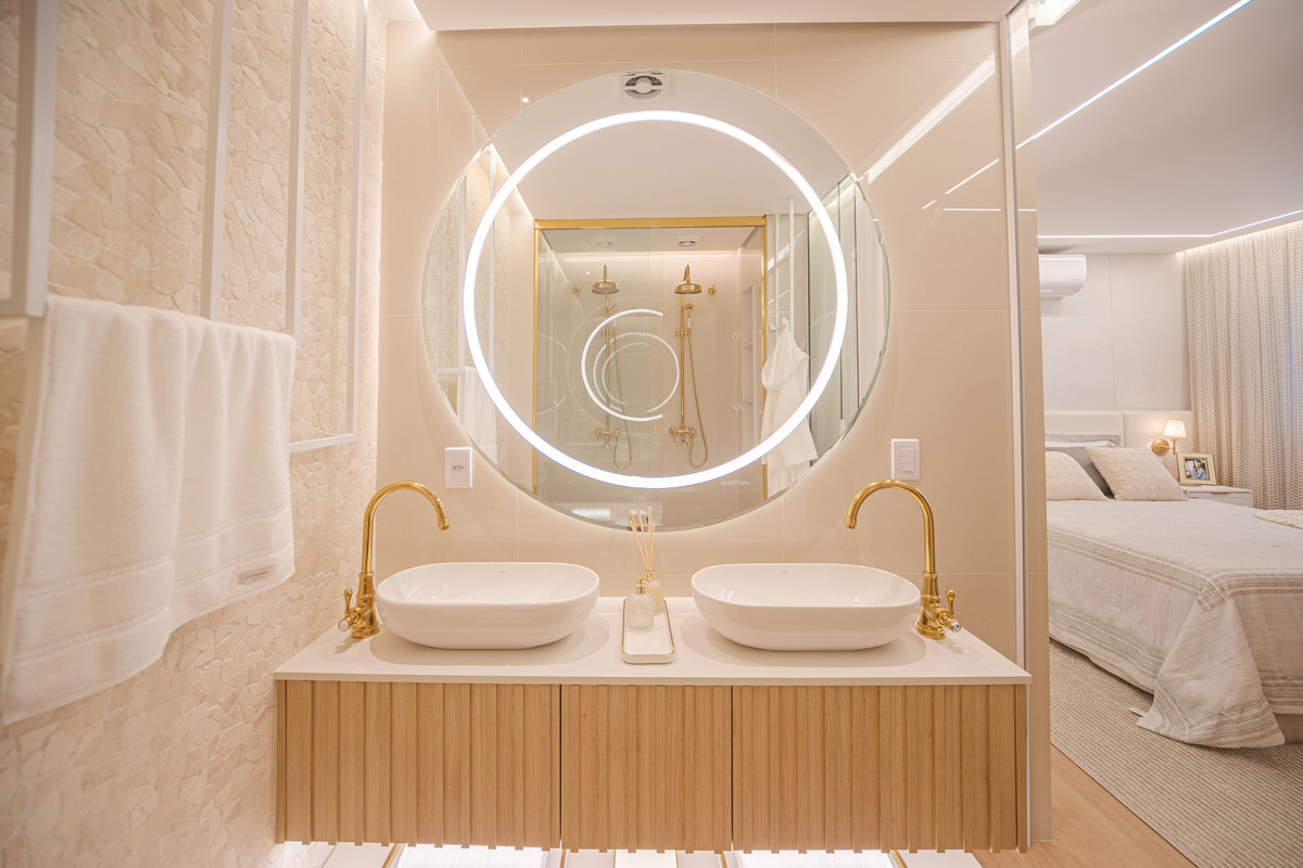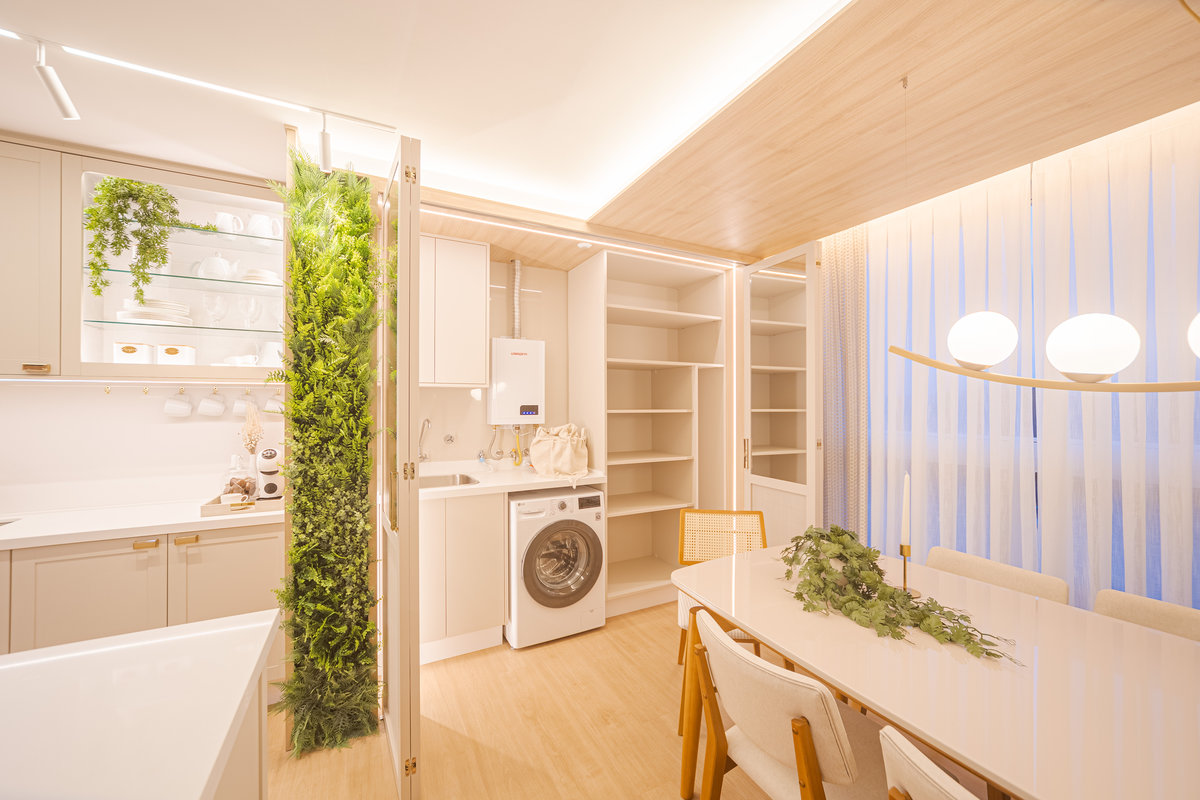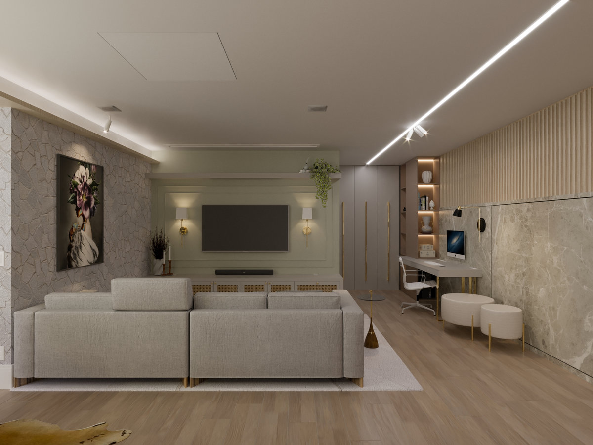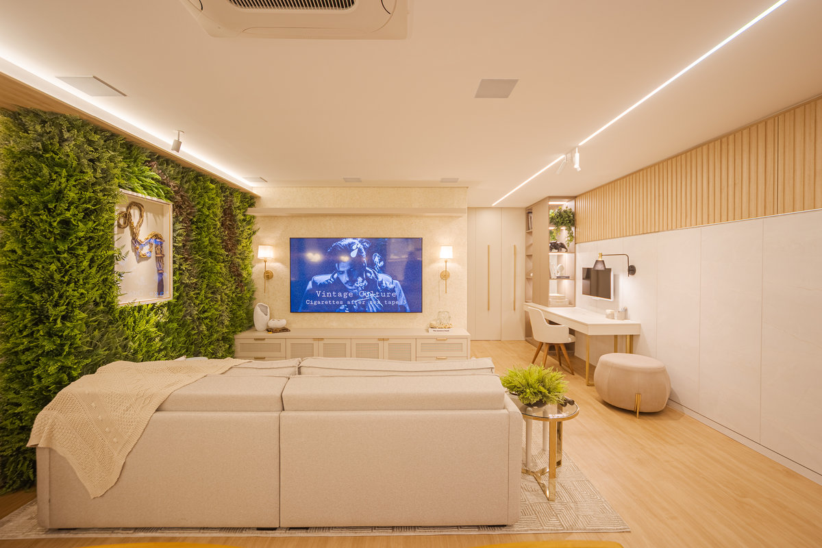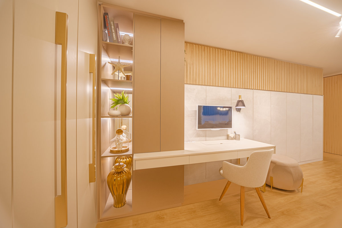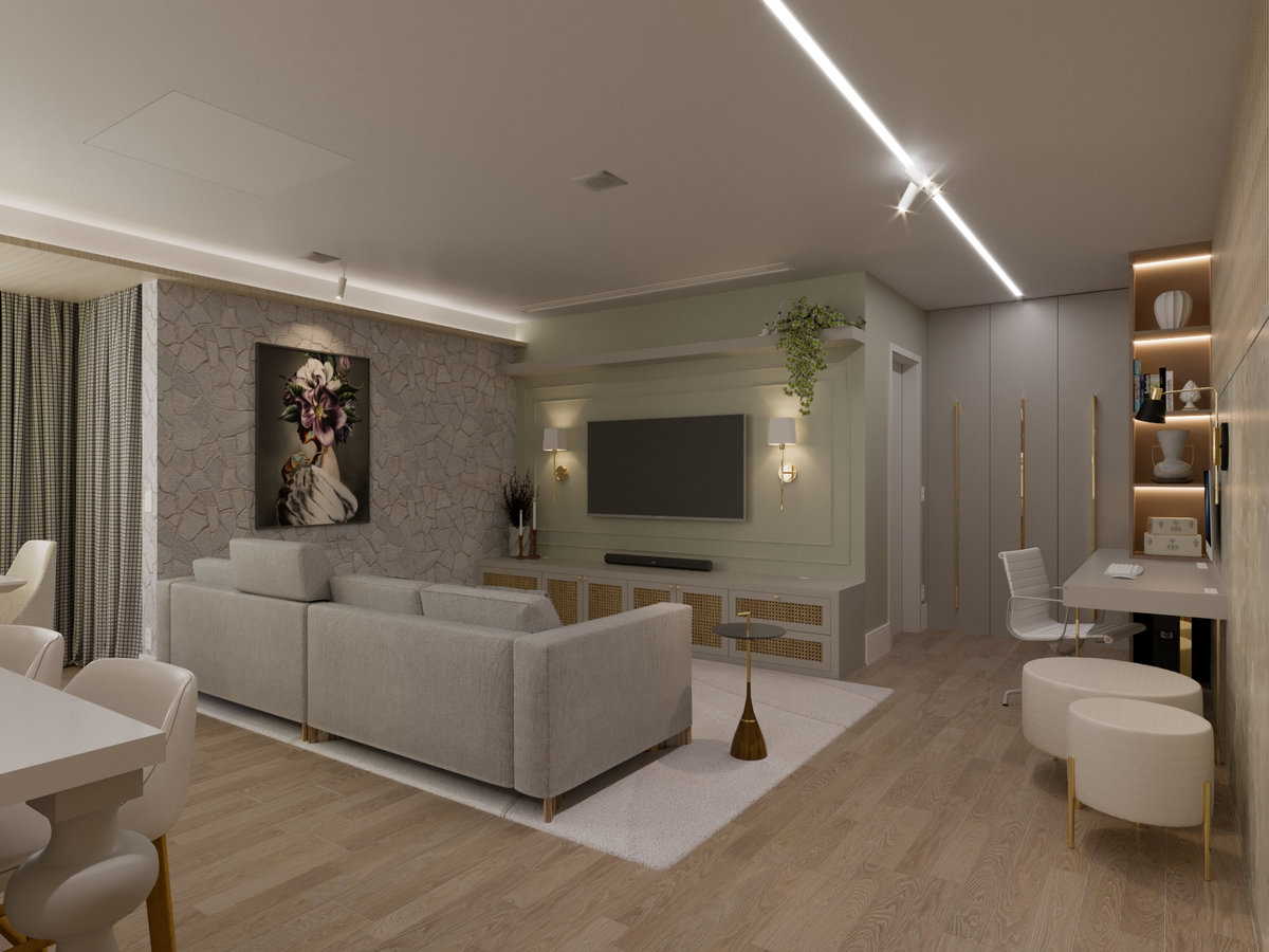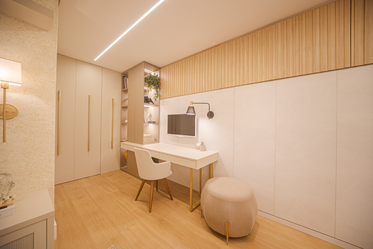 A cozinha integrada é um dos pontos de destaque, com ilha central que funciona como espaço de preparo, apoio e convívio. Os armários em acabamento clean e os metais dourados trazem delicadeza e sofisticação, enquanto a marcenaria sob medida garante funcionalidade e organização. A iluminação linear embutida valoriza o design e proporciona um clima moderno e intimista.