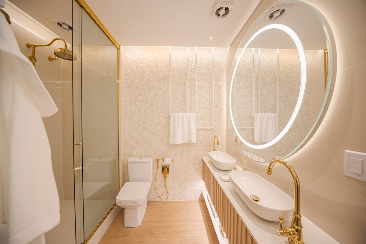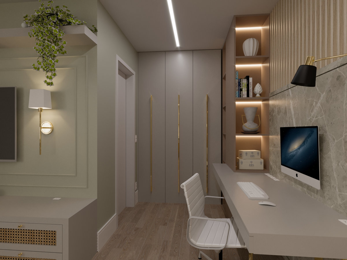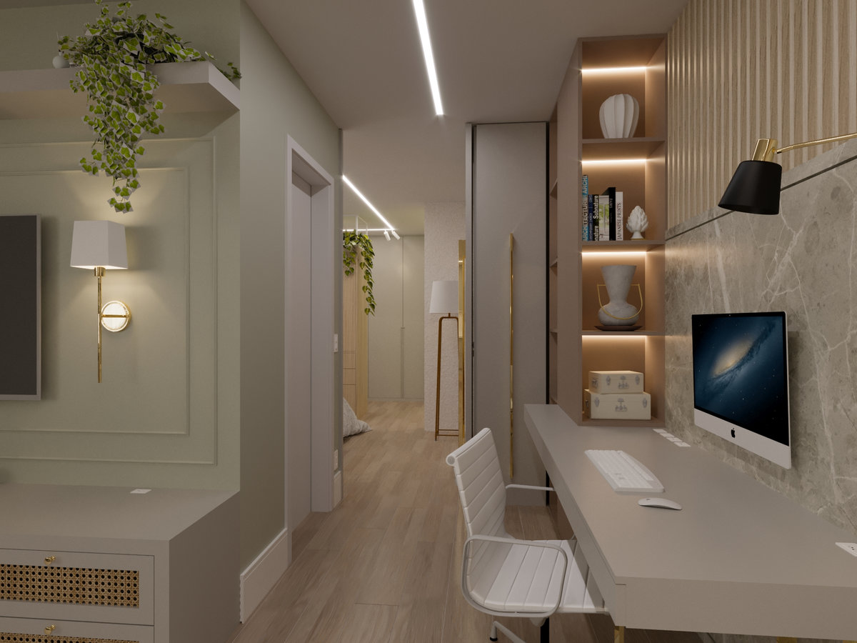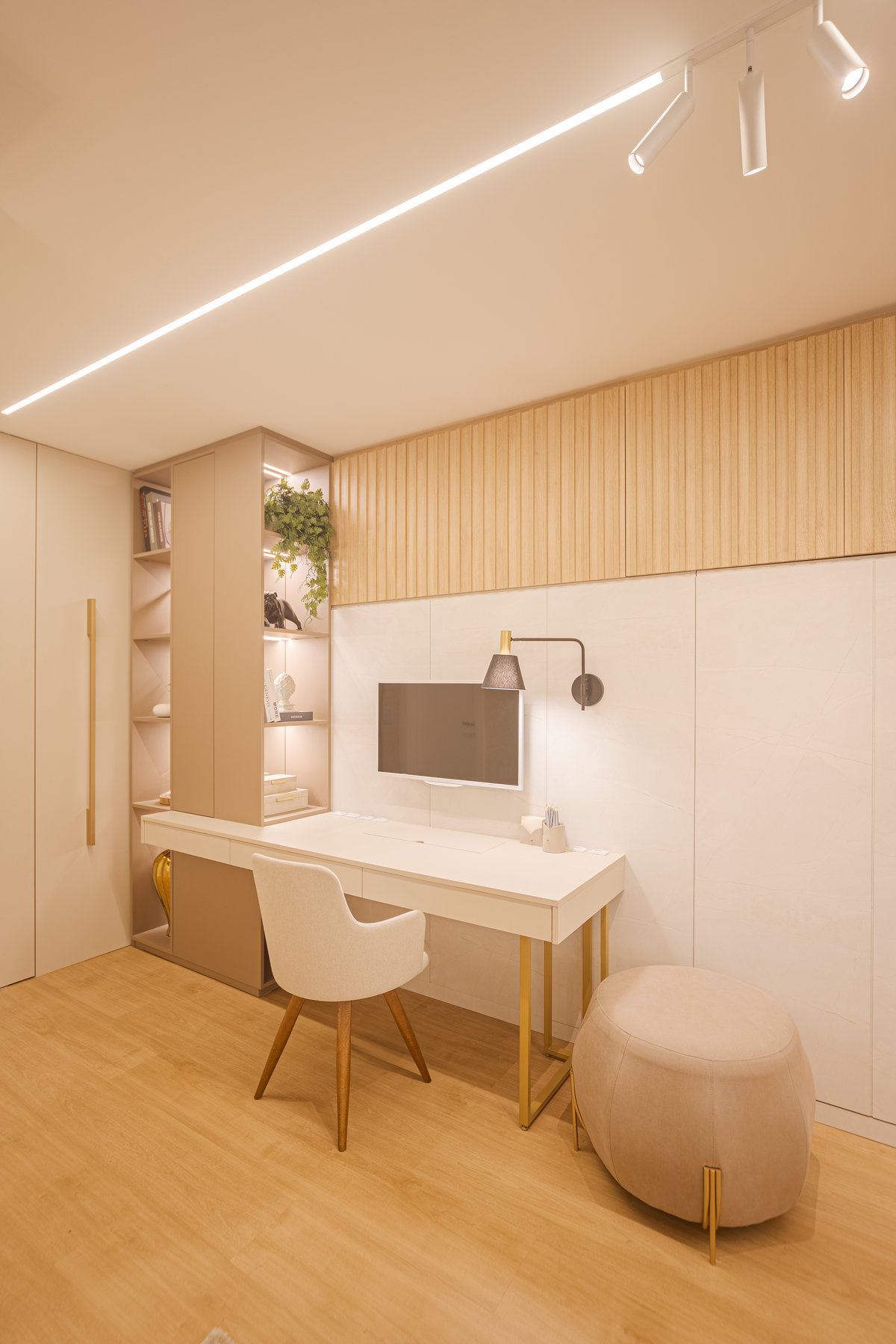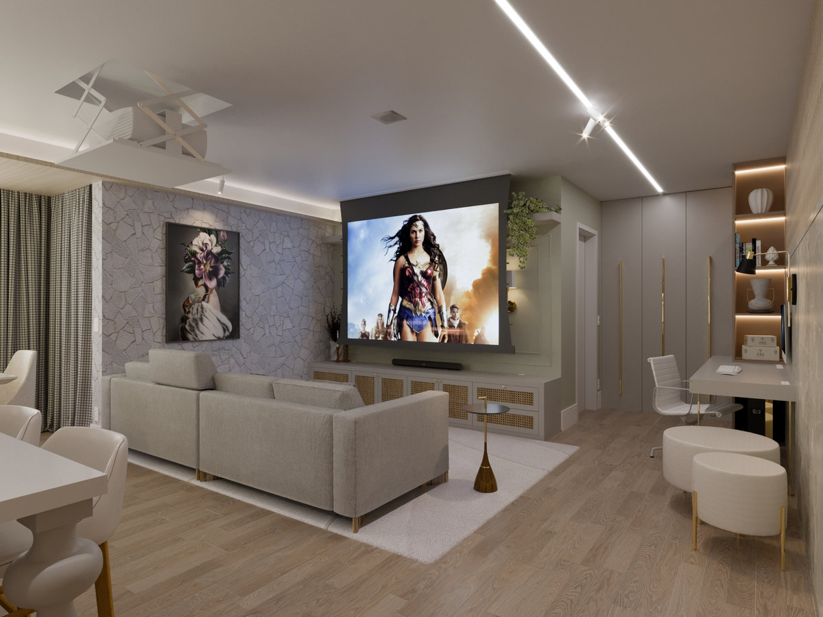 A cozinha integrada é um dos pontos de destaque, com ilha central que funciona como espaço de preparo, apoio e convívio. Os armários em acabamento clean e os metais dourados trazem delicadeza e sofisticação, enquanto a marcenaria sob medida garante funcionalidade e organização. A iluminação linear embutida valoriza o design e proporciona um clima moderno e intimista.