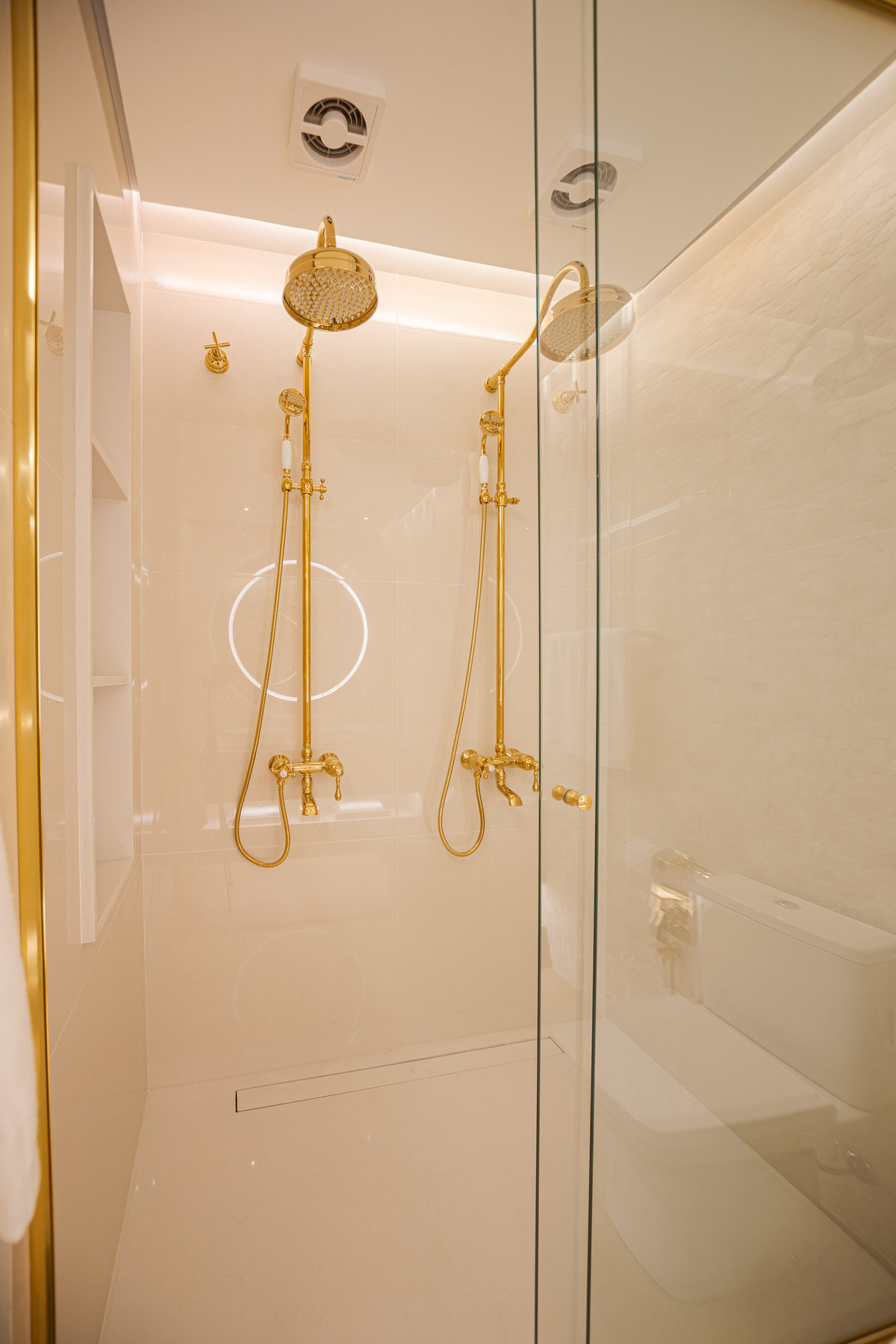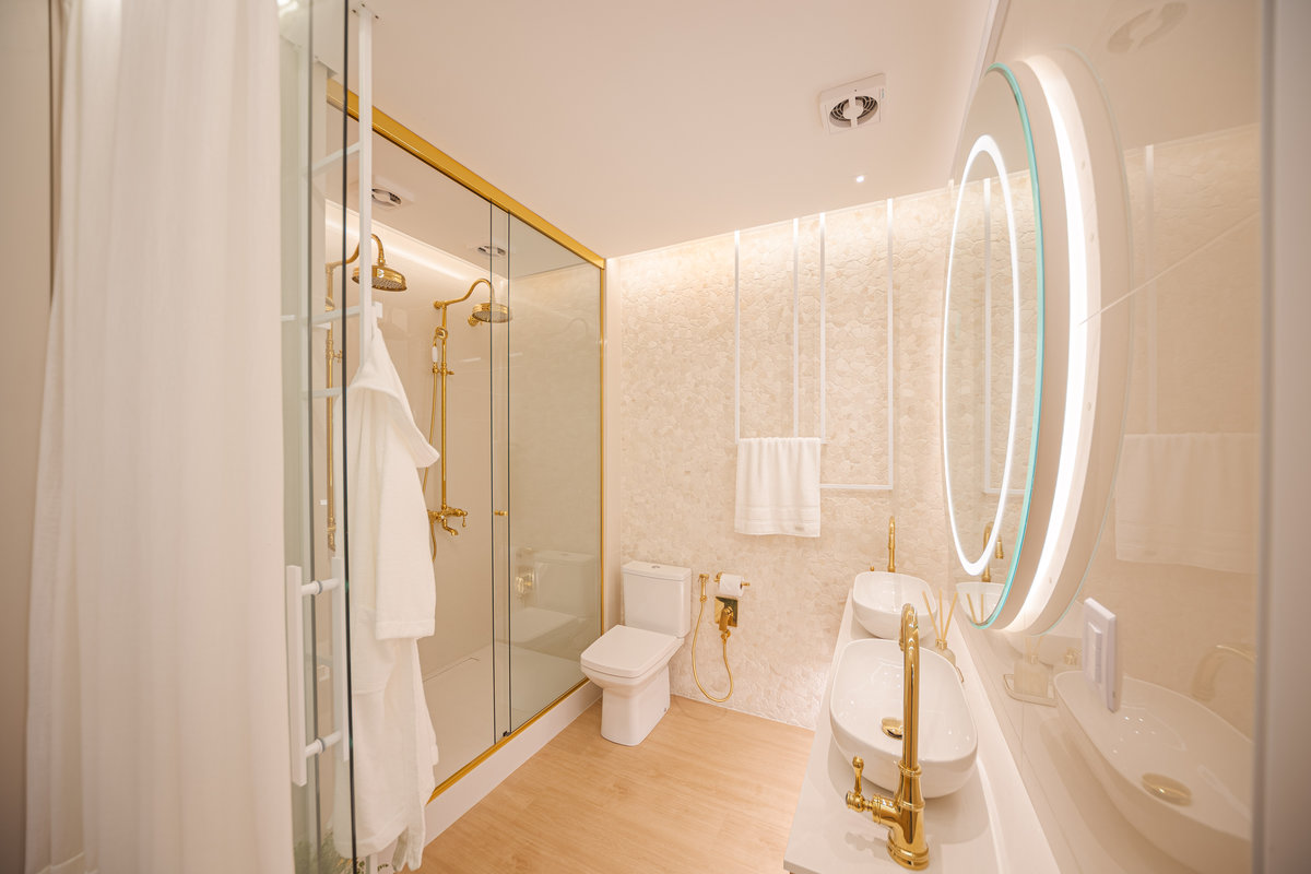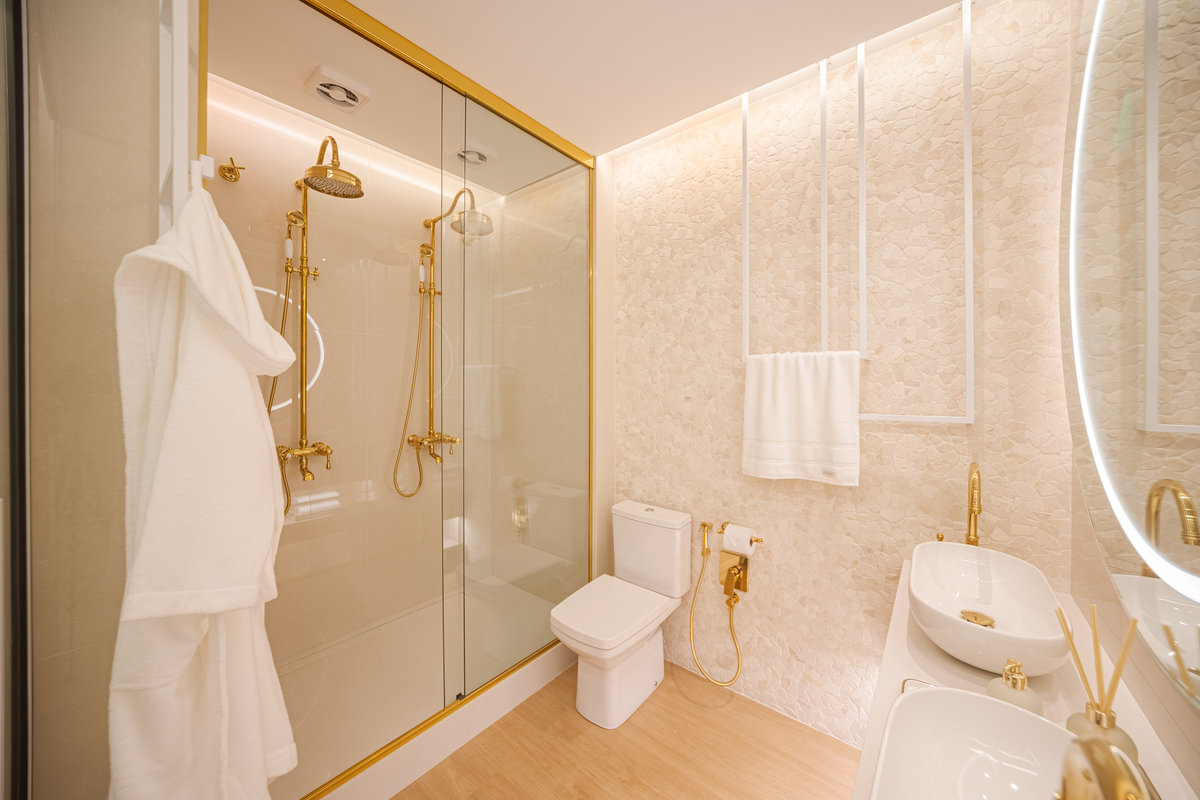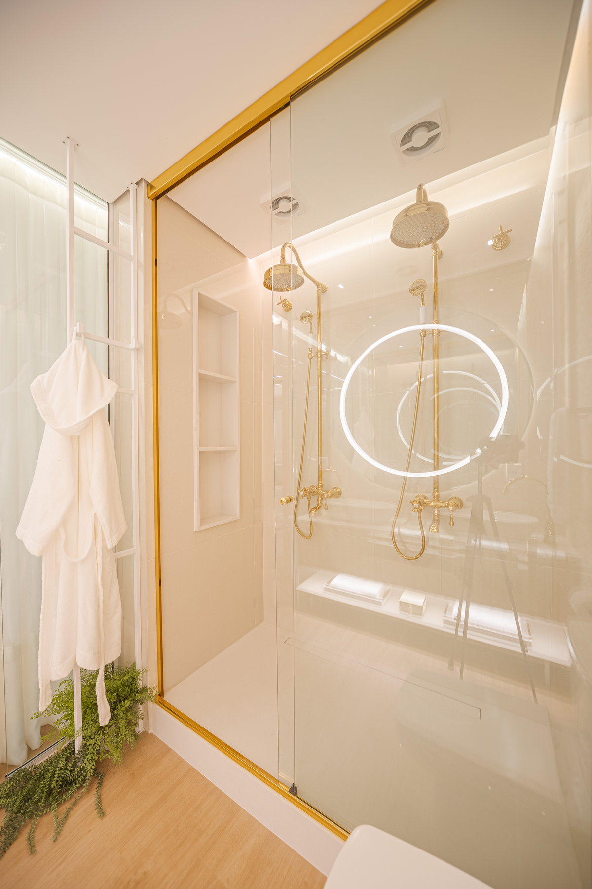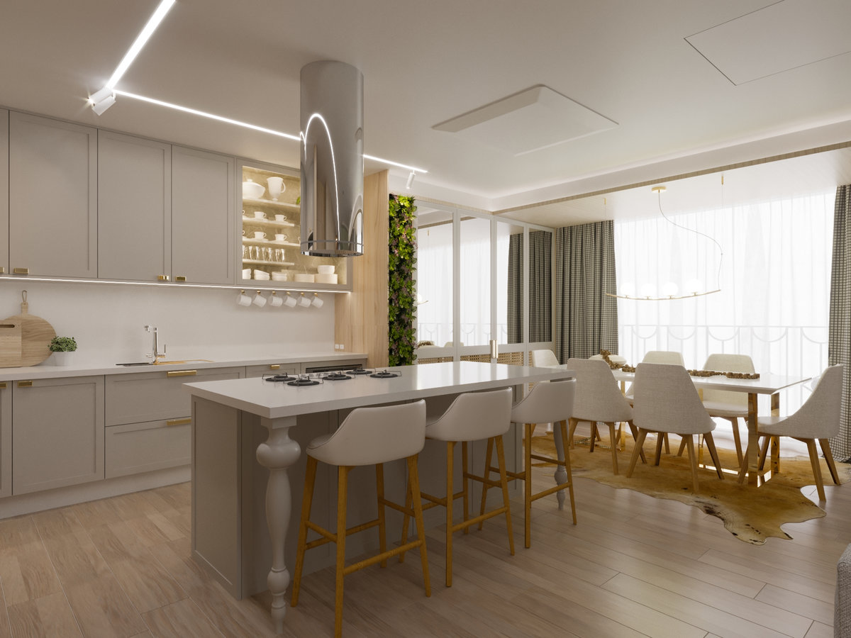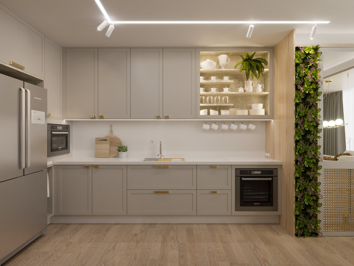 A cozinha integrada é um dos pontos de destaque, com ilha central que funciona como espaço de preparo, apoio e convívio. Os armários em acabamento clean e os metais dourados trazem delicadeza e sofisticação, enquanto a marcenaria sob medida garante funcionalidade e organização. A iluminação linear embutida valoriza o design e proporciona um clima moderno e intimista.