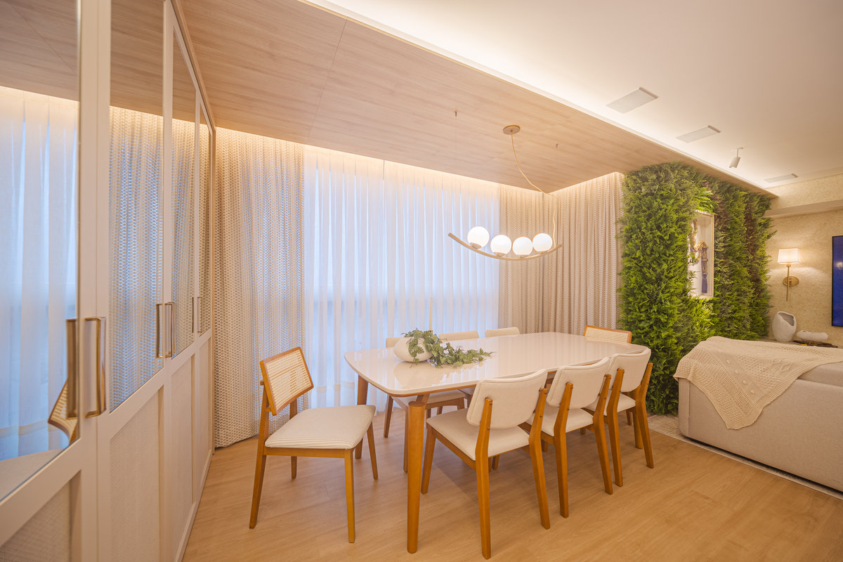 Na área social, o conceito aberto conecta sala de estar, jantar e cozinha, favorecendo a interação entre os moradores e convidados. A parede verde e o uso de plantas reforçam a conexão com a natureza, trazendo frescor e vitalidade ao espaço. A sala de jantar, com mesa ampla e pendente de design marcante, convida a momentos especiais e de convivência.